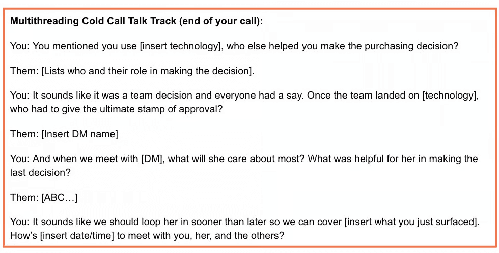 Steal my script structure: Multithreading Talk Track, tweak it for your business then roll it out to your SDRs in a training sesh.