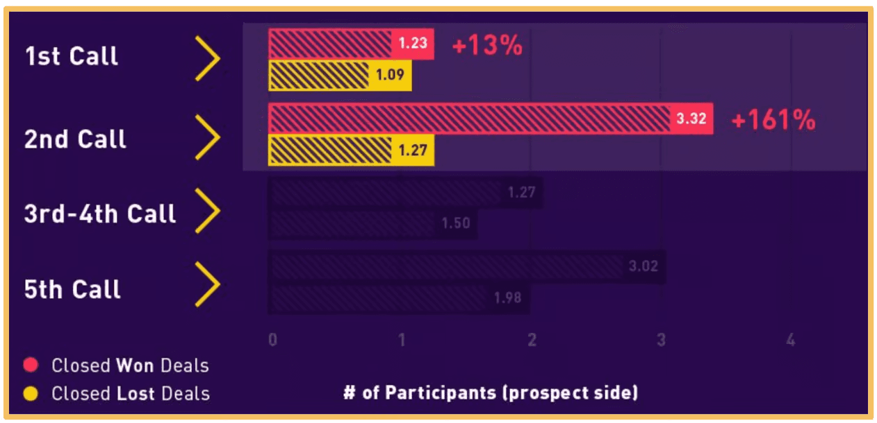 Below you can see some data from Gong that found on average a closed won deal had more participants on the first call than closed lost.